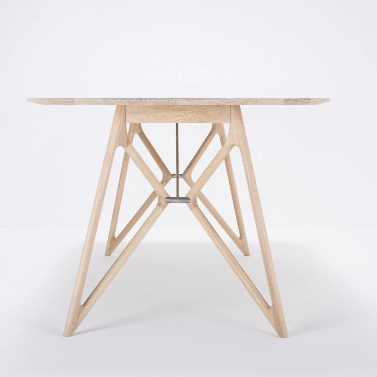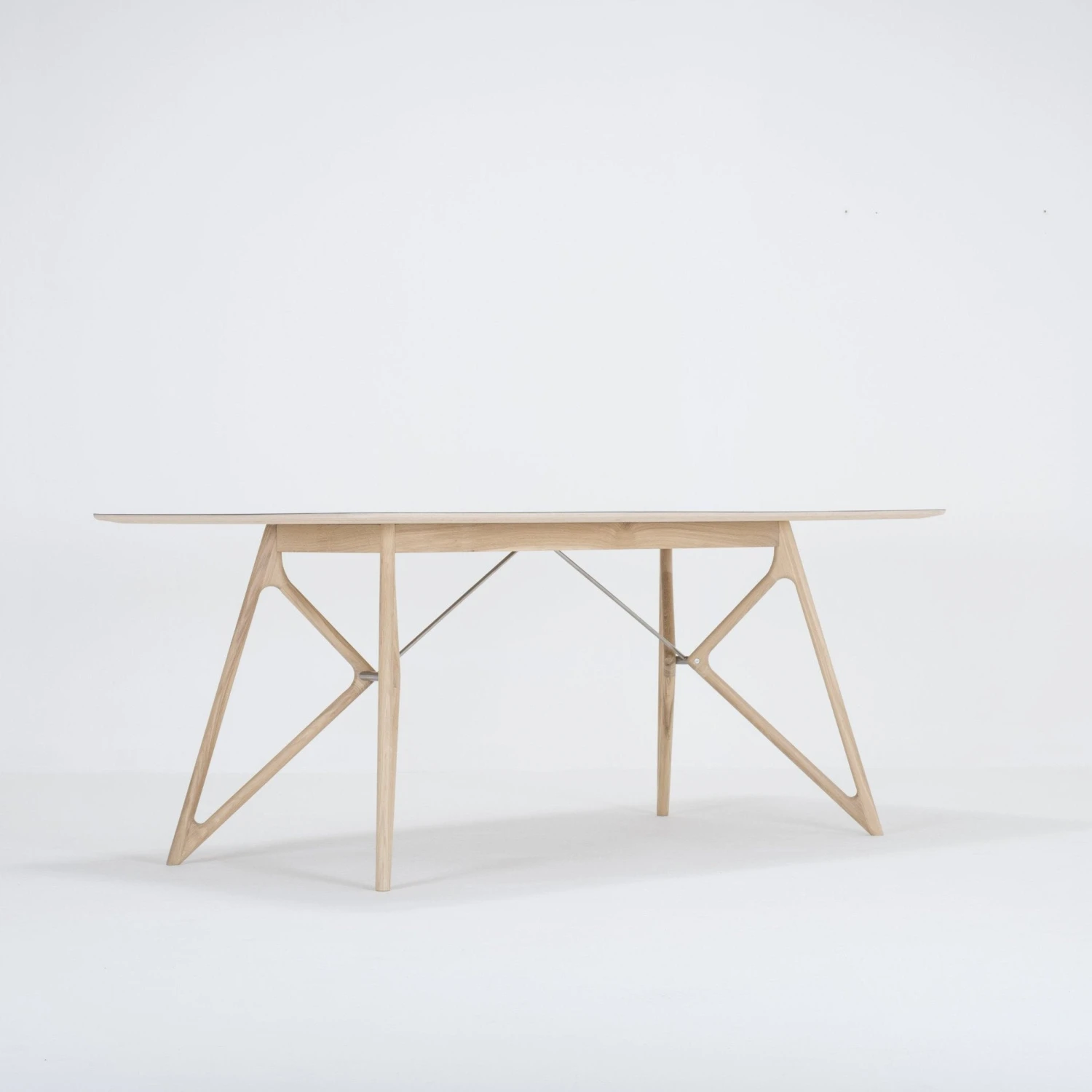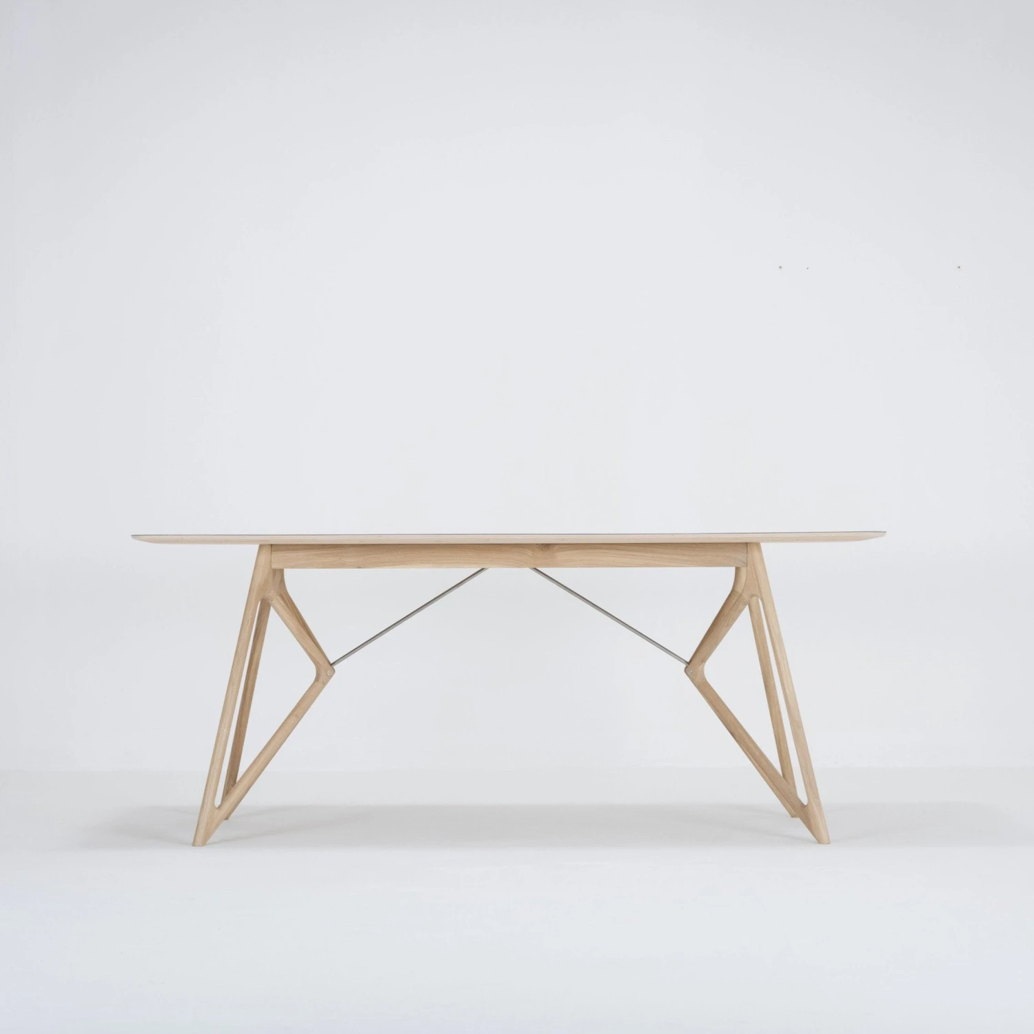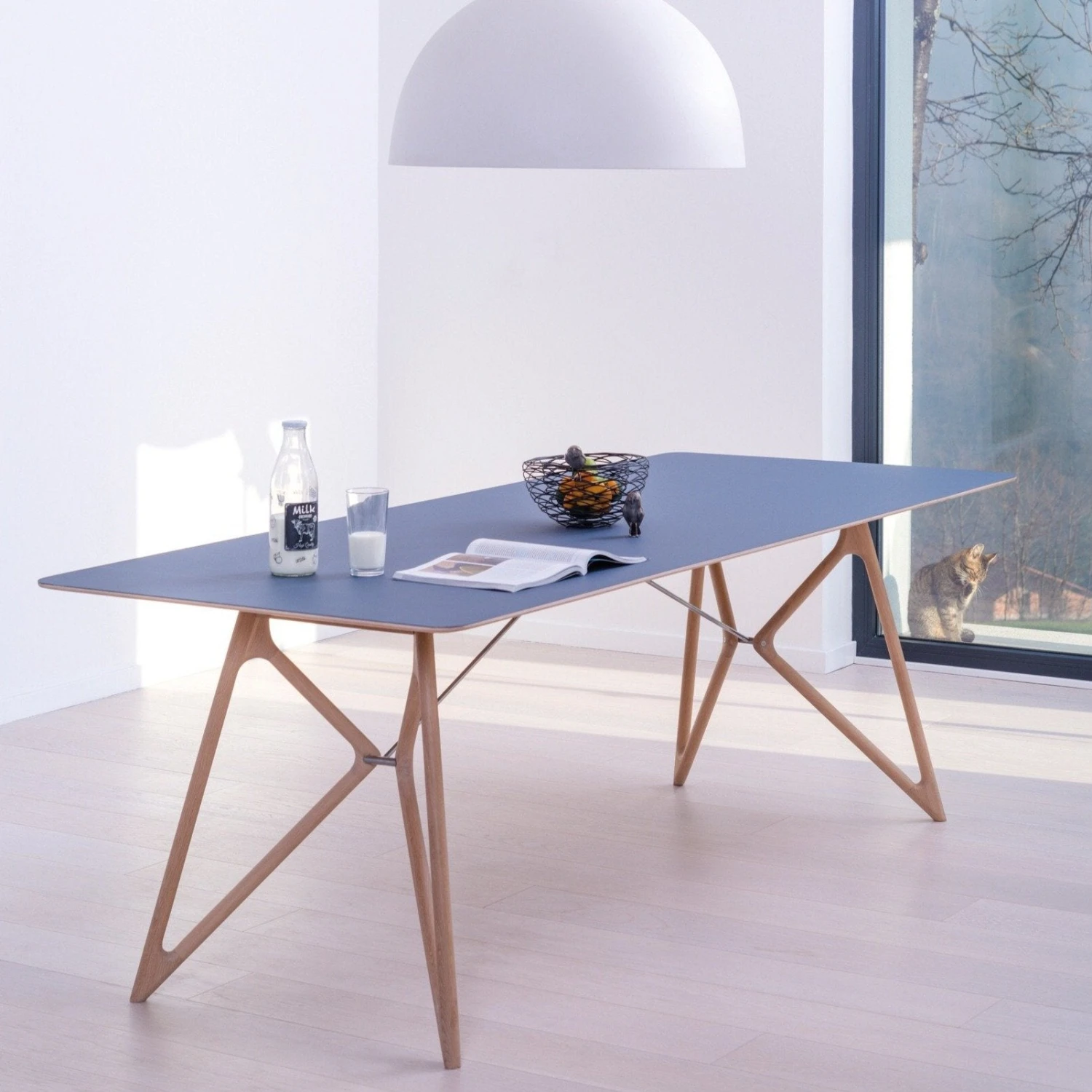 Der Tisch TINK von Gazzda besticht durch die besondere Form der Beine, die schon fast einer künstlerischen Skulptur ähneln. Sie geben dem Eichentisch mit praktischer und wunderschöner Linoleumplatte einen fast schwebenden Charakter.