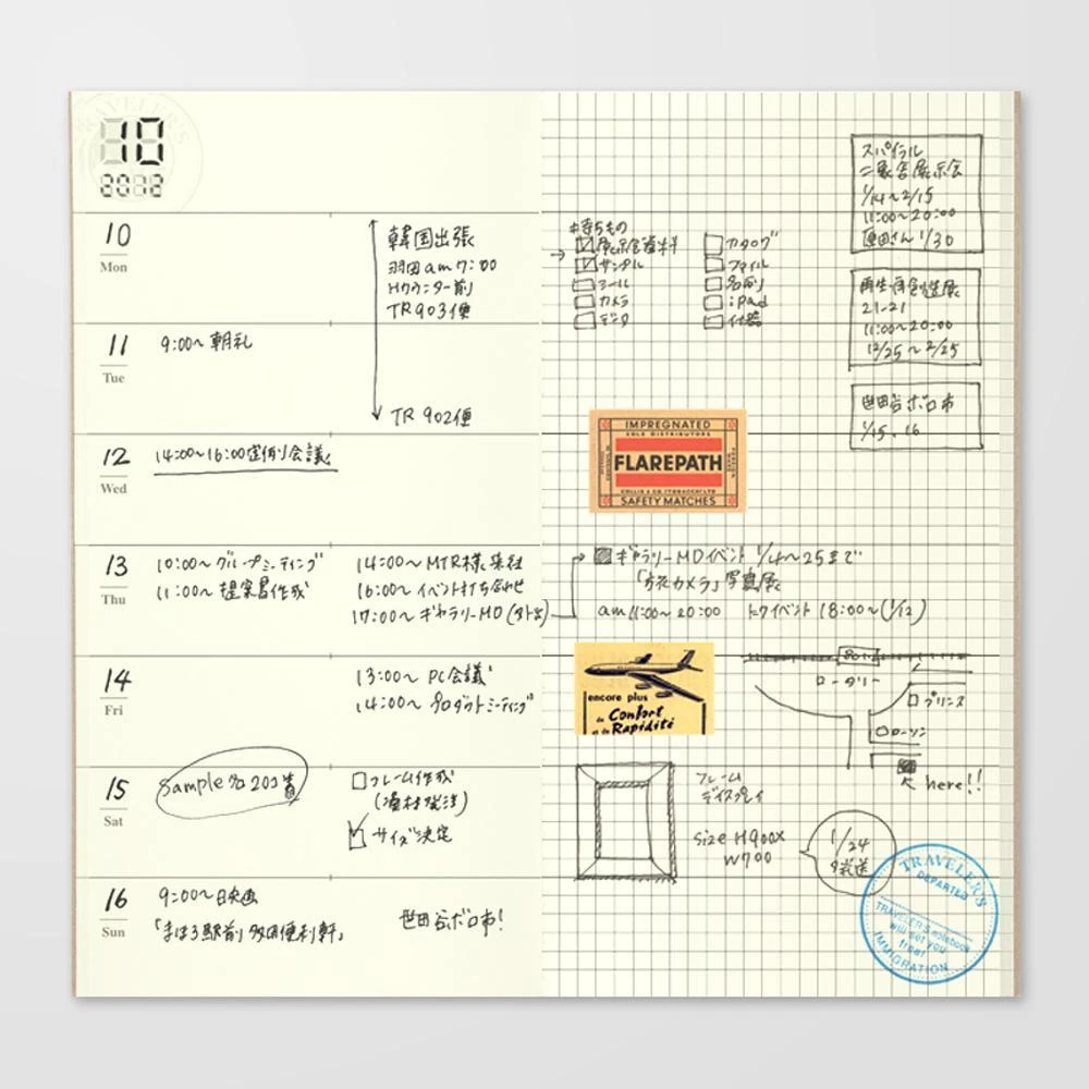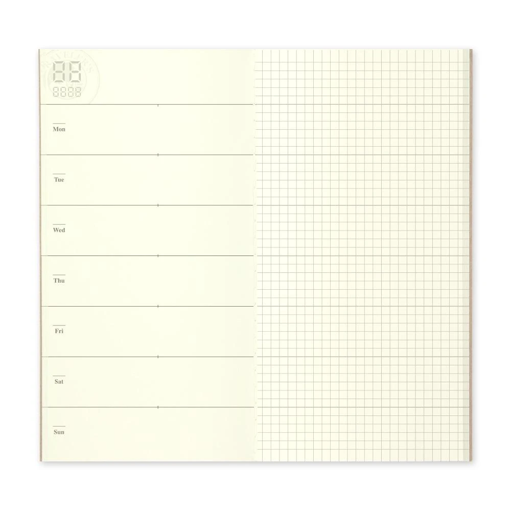 Ein undatierter Wochenkalender für Dein Traveler’s Notebook. Für jede Woche ist eine Seite zur Verfügung. Auf der gegenüberliegenden Seite hast Du Platz für Notizen und Skizzen.