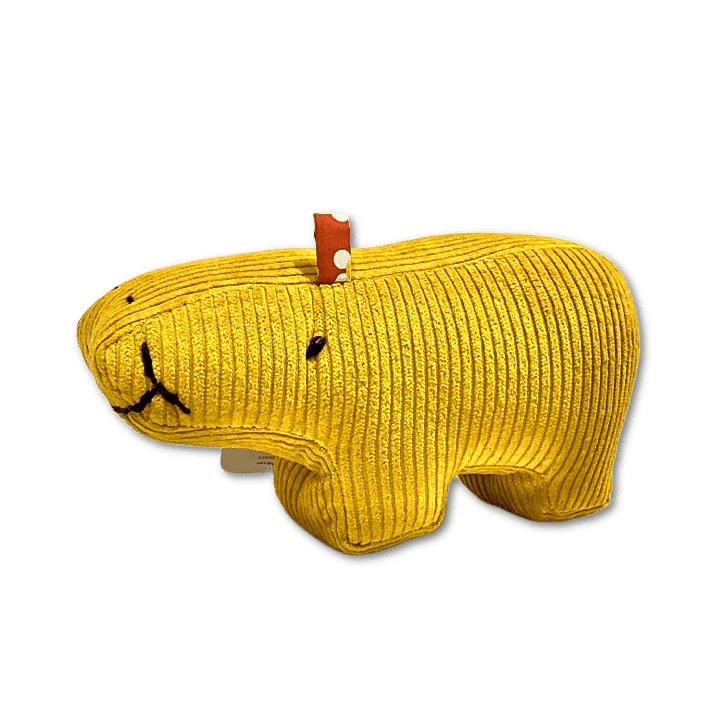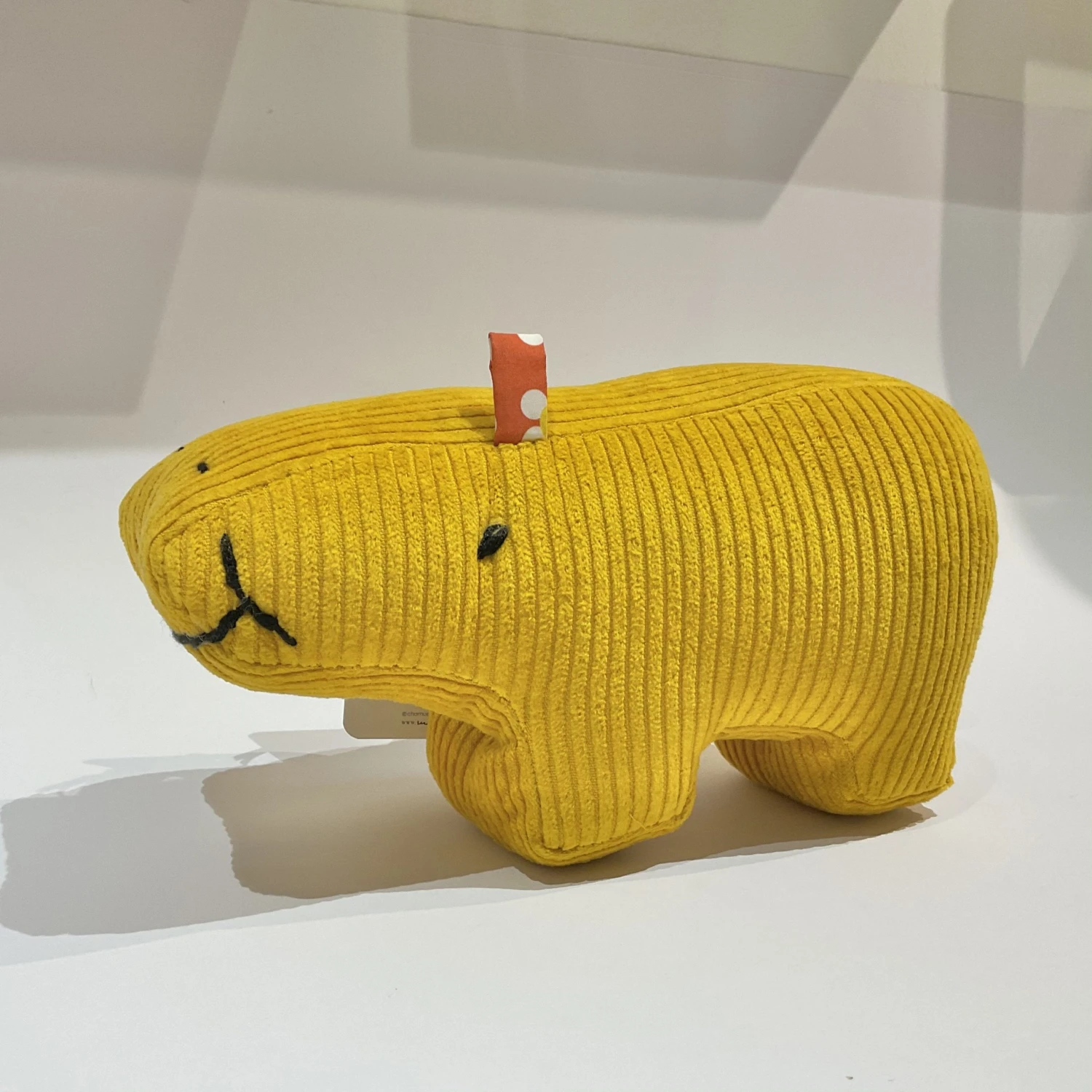Ein gelbes Nilpferd aus Breitcord lädt zum kuscheln ein. Wenn die Schlafenszeit losgeht lässt du es La Le Lu singen, denn im Inneren verbirgt sich eine Spieluhr.