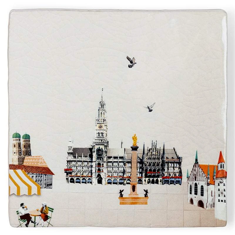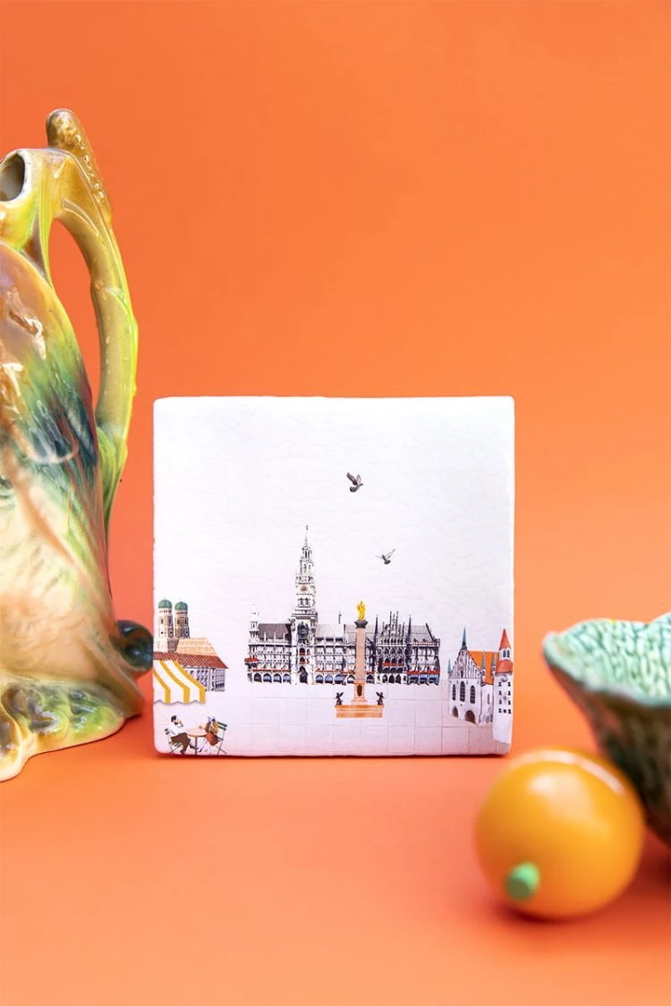 Das Münchner Rathaus, die Frauenkirche, der Marienbrunnen… was entdeckst Du noch auf dieser hübschen handgemachten Fliese?