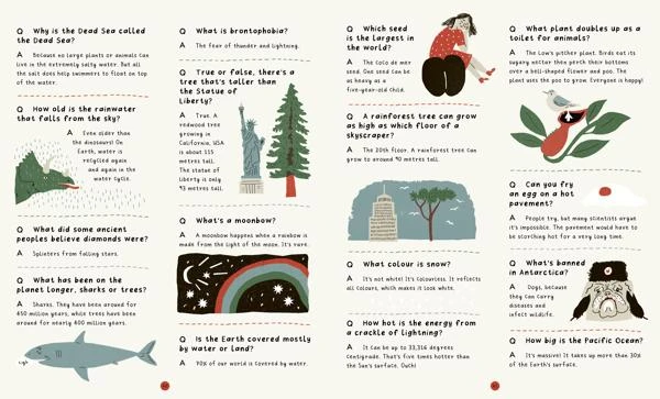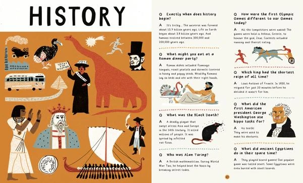 The dazzling facts are accompanied by bright, whimsical illustrations and the questions are organized into 10 chapters: Human Body, Science and Technology, Animals, Natural World, Space, Mindbending Stuff, History, Customs and Culture, Our World, and Arts and Entertainment.