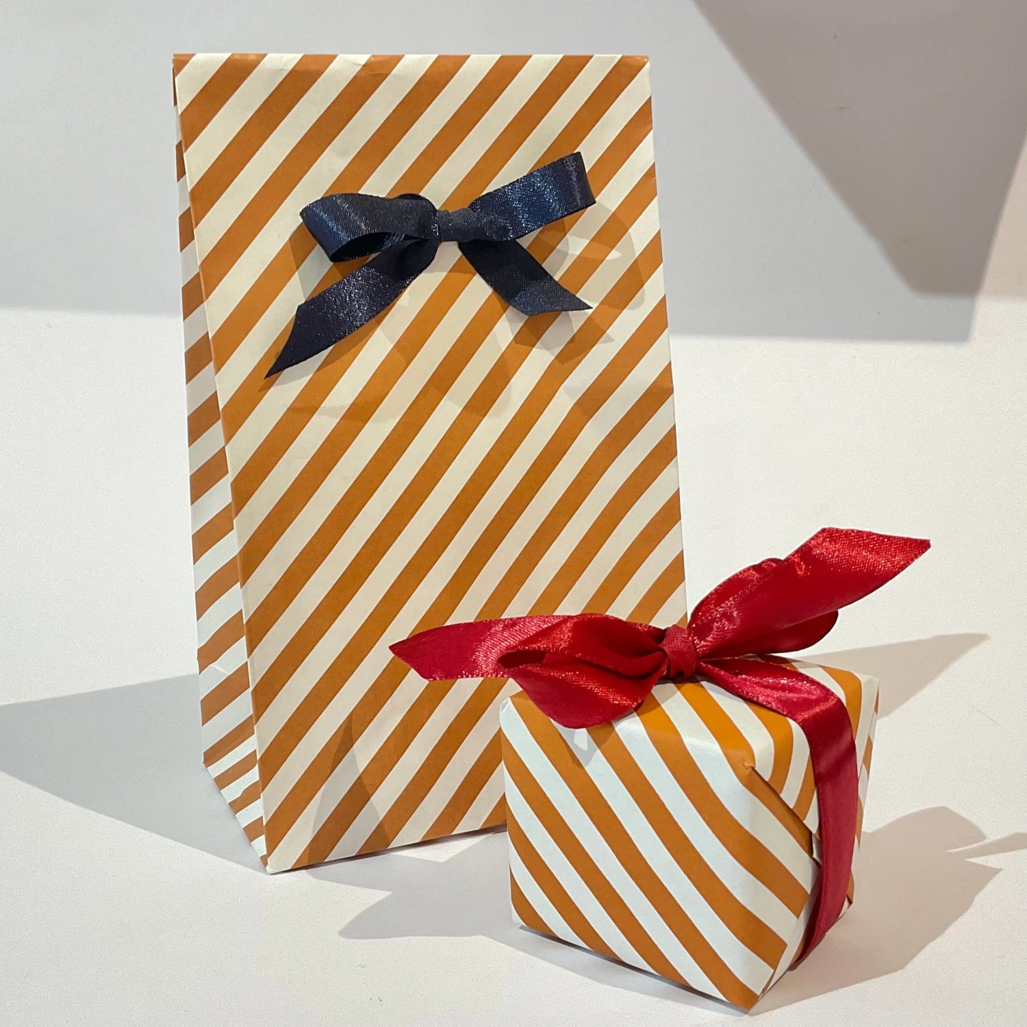 Je nach Größe und Beschaffenheit verpacken wir Deine Einkäufe bei uns als Geschenk sorgfältig in unserem fröhlichen gestreiften Geschenkpapier mit Satinband.